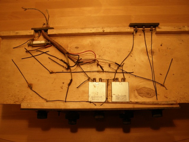 Kytketty pohjan läpi yksilankaisilla johtimilla, yksi vastuksen pidin ja alapuolella kolme kondensaattoria!