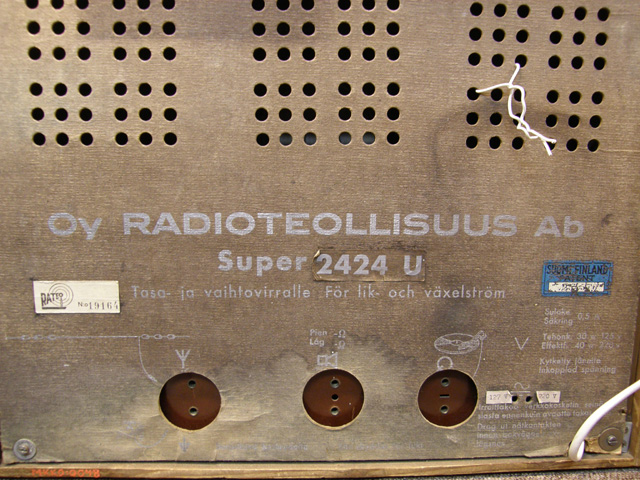 Tällainenkin arvoitus oli tuolla odottelemassa päivänvaloa... Näyttää Radioteollisuuden Super 2424U:lta koteloltaan, mutta tämä ei ole yleisvirtakone, putket perinteisesti: ECH21, EF22, EF22, EBL21 ja AZ1. Laitan kuvia, jospa arvon raati tunnistaa mallin/merkin. Asteikkolasissa ei ole "RATEO"-merkkiä. Tämä on puutteellinen, mutta olen katsonut sen säilyttämisen arvoiseksi tuollasenaan, ellei sitten satu löytymään puuttuvia osia...