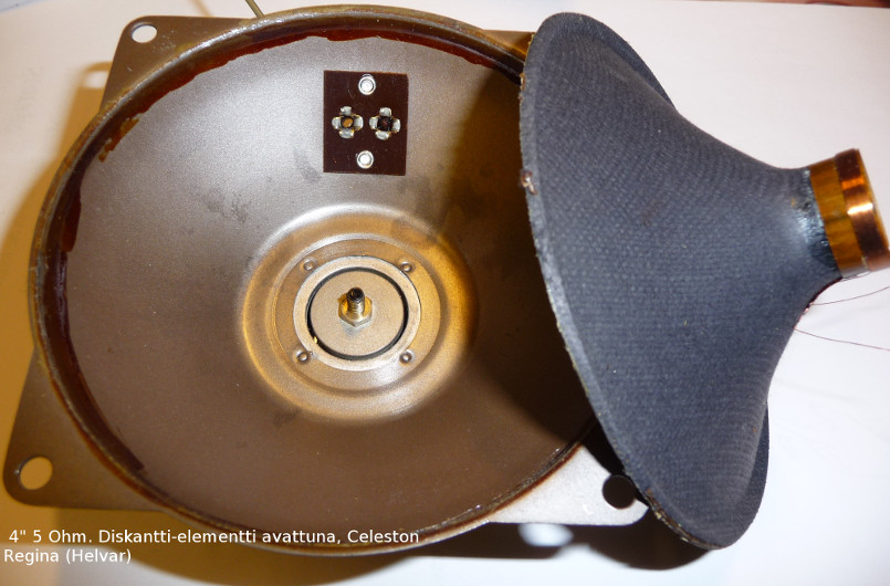 Diskatti-elementti on irrotettu levystä prikoilla, no siinäkin on siis sama oikosulku. Tein jo pahvista tiivisteen ja laitoin paikoilleen. Kun sitten yritin kuunnella kaiutinta, ei se pihahtanutkaan. Mittaus osoitti vastuksen olevan ääretön eli äänikela on poikki. En löytänyt katkosta, on varmaan piilossa kelan sisällä.