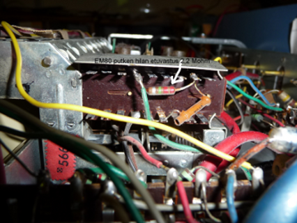 Tarkastin myös näköviritysputken (EM80) hilalle menevän johdotuksen ja huomasin vastuksen olevan 2,2 MΩ (alkuperäinen), kun kytkentäkaavion mukaan arvo olisi 1,0  MΩ.