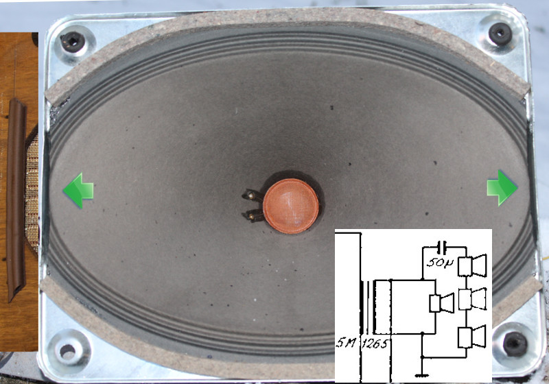 Iso ovaalielementti toimii, mutta molemmista reunoista on kaiutinpahvista leikattu pala pois tehtaalla, jotta sen on saanut sopimaan metallirunkoon. No tästä tietty syntyy akustinen oikosulku kovaäänisessä (vihreät nuolet).