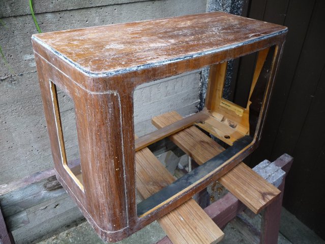 Tässä kuvassa Celeston Reginan kotelo on maalinpoiston jäljiltä, tulos on vähän epätasainen. Lakkanpoisto vaatii vielä uuden käsittelyn, mutta siihen käytän Tinneriä. Kotelo on lakattu selluloosalakalla, niinkuin lähes kaikki tuon ajan puulaatikot Suomessa (1958).
