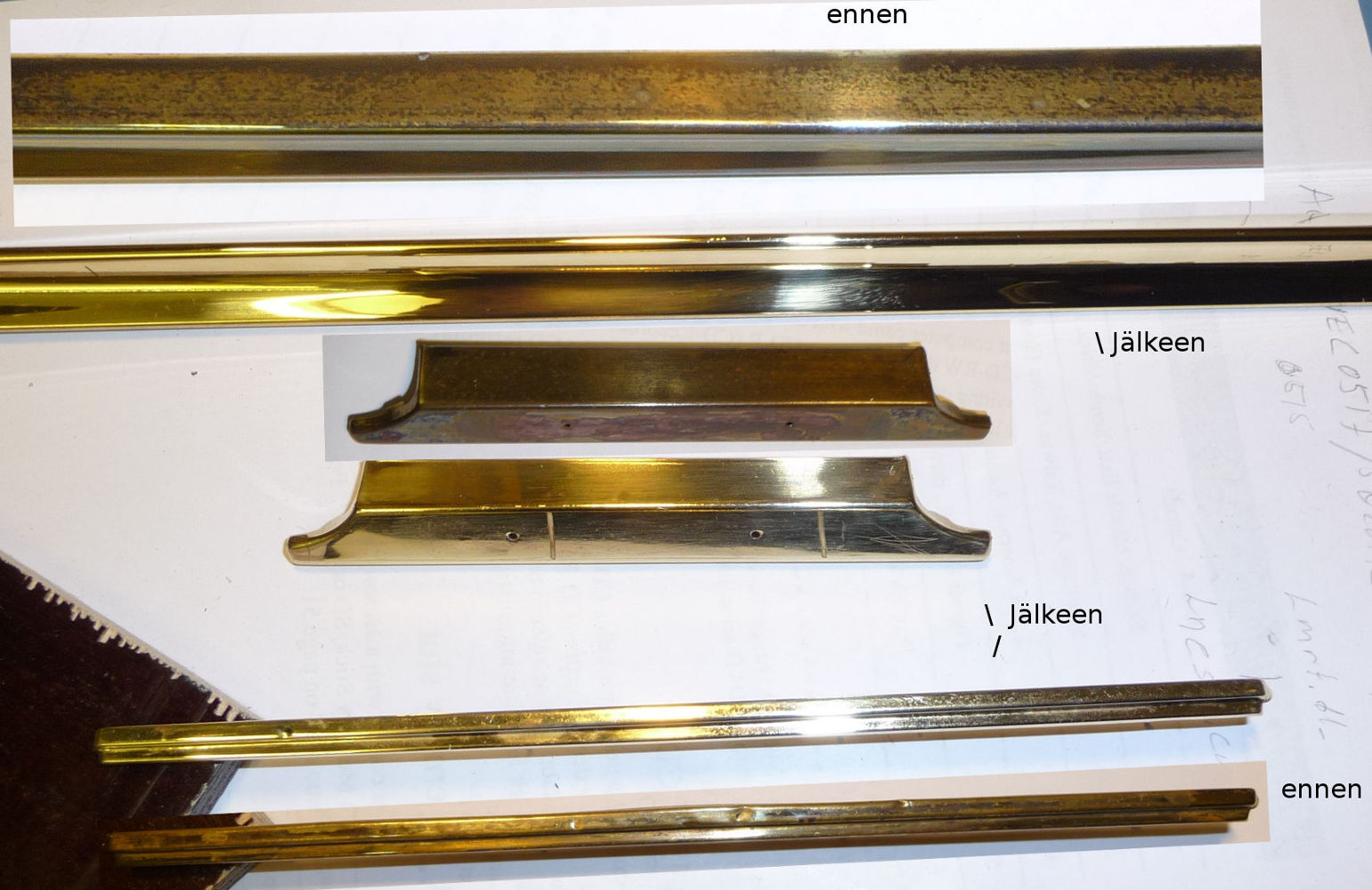 4. ilmeisesti tuo etikka oli vähän poistanut messingistä sinkkiä tai lyijyä kun osissa näkyi punaisuutta ja pronssin sävyjä. Kiilloitukseen käytin 3M_Finesse-IT_9639 kiillotusnestettä ja lakanakangasta puutikun ympärille kierrettynä ja nitojalla kiinni siinä. Tippa k-ainetta ja sitten hankaamaan, kun teho häviää uusi tippa ja taas töihin.