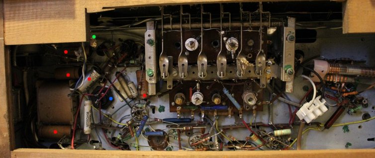 paina ula nappi alas ja tutki hehkut - mittaa hehkujännitteet. Pitäisi olla n. 6 V (240 V asetus) ja katso loistaako kaikki putket vähän jostain kohtaa, jos ei niin putken hehkulanka saattaa olla poikki tai huono kontakti. Putki irti ja vastusmittaus 4-5 pinneissä pitäisi näkyä joku vastusarvo (jos suuri, niin vikaa tod. näk.). Tässä vaiheessa radiossa ei ole anodijännitettä ja hehkutus voi myös parantaa putkin ominaisuuksia kun kesto on alle puoli tuntia) Jos mikään hehku ei pala niin vika on muuntajassa tai sulakkeessa tai kytkimessä.