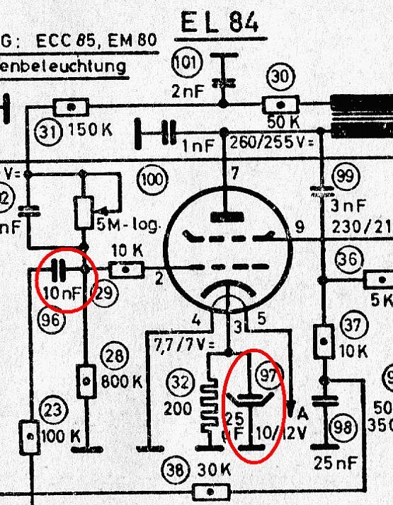 Nuokin mittaukset sain kun vertasin tuota paperia, koneen kytkentää ja noita kuvias et sain jotain tolkkua tuosta irti. Mutta radion valot toimii, jotka on kiinni samassa kelan liittimessä kuin tuo katodi, siinäkin on yksi konkka välissä mutta minkä arvon konkka on kyseessä... täytyy tuota paperiakin käydä läpi vähän tarkemmin ja ottaa lähäikuva tuosta nurkasta jossa tuo putki sijaitsee.