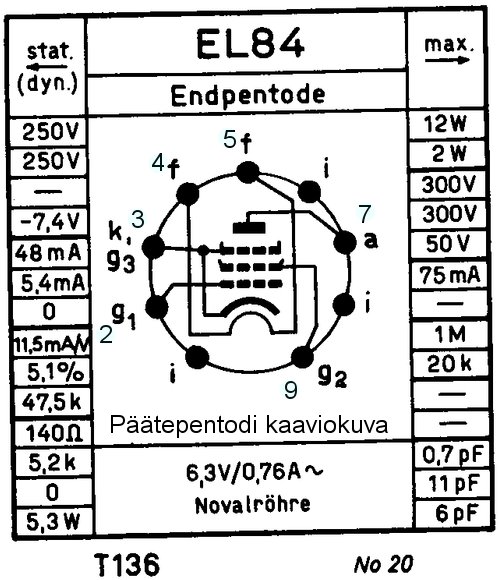 Putkikuvat ovat sama kun sinun radion pääteputki. Siinä hehkujännite (vaihtovirta) tuodaan putkikannalle liittimiin 4 ja 5. Hila on 2 (g1) ja toinen hila on 9 (g2), kolmas hila on tässä putkessa yhdistetty katodiin 3 (k, g3) putken sisällä. Kuvassa EL84a on katodijännitteeksi merkitty 7 - 7,7 V= (tasajännitettä) jos kaikki on kunnossa. sen jännitteen voi mitata kuvan kondensaattorin navoilta. Anodijännitteen voit mitata putkikannalta liittimeltä 7 (a) ja rungon väliltä Tässä kuvassa se on 260 V). Sun radiossa voi olla enemmän. Putkikanta on esitetty siten kun katsot radiota komponenttipuolelta (alapuolelta) ja numerointi kiertää myötäpäivää (myös kossu aukee myötäpäivään). Kuva EL84b olen lisännyt kytkentäpisteiden numerot ja siinä on myös noista toiminoista lyhenteet a= anodi, k= katodi, f= hehkut.