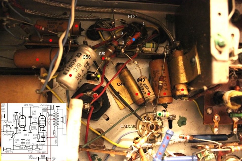 Tarkista sinisen pisteen kohdalla oleva vastus, pitäisi olla 1k ohm. (1000 ohm) ja kytketty putken kannalla liittimeen 2 (hila g1), tässä näyttää siltä että C49 ja edellämainittu vastus on vaihdettu jonkun korjauksen yhteydessä (kannattaa vaihtaa). Elektrolyyttikondensaattori C56 ( uusi 47 mikrofaradia, 63 V) ja vastus R36 ( 200 ohm. ½ W metallikalvovast.) kannattaa myös vaihtaa (käytä molemmissa metallikalvovastuksia 0,5 W tehoisia) ja nämä katodikonkka ja vastus voidaan liittää samaan pisteeseen (merkattu keltaisella, tarkista myös että muuntajalta tuleva kirkas johto on liitetty tähän pisteeseen.