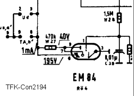 - EM84/ 7,9 on 38V (kaaviossa 70V), jännite ennen vastusta R54/470K (vastus ok) on 212V, onko putki vikaa? Loiste haaleaa, ei sulkeudu keskelle asti, korvaavaa putkea ei ole millä kokeilla.