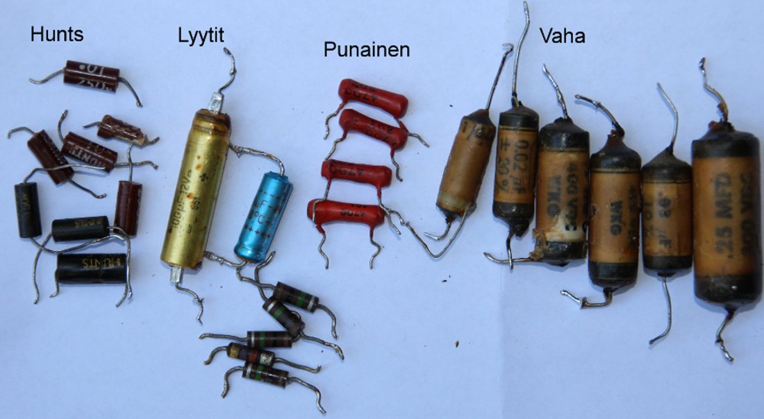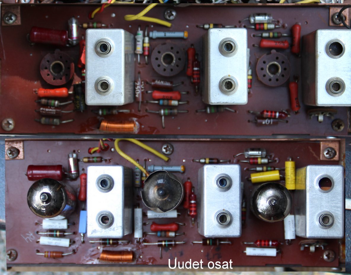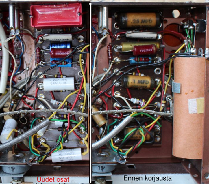 Homma jatkuu - vaihdetut osat: (kuva), nykyarvot mitattu kapasitanssimittarilla Hunts 5 nF, arvo nyt 5,9 – 6,0 nF (basso potikalla) Hunts 10 nF, kondensaattorien arvot seuraavat: 17,5 – 16,1 – 17,0 - 21,2 – 20,3 nF Hunts 40 nF- nyt 51,6 Punainen 20% 4,7 (kaaviossa 5 nF) arvot nyt: 3,8 – 3,6 – 4,1 – 4,19 nF. Näillä konkilla on sellainen ominaisuus, että niiden arvo laskee mitattaessa n. 100 pF (2 min). Vaha 10 nF, nyt 18,7 – 14,9 - 15,2 nF Vaha WKG 250 nF, nyt 325 nF Vaha WKG 30 nF, nyt 42 nF Vaha WKG 100 nF, nyt 148,5 ja 151,5 nF Vaha Farac 20 nF, nyt 33,2 nF Elko 100 µF arvo nyt: 153,4 ja 129.2 µF Hiilimassavastuksia 1 MΩ, arvot nyt 1,21 – 1,22 – 1,26 ja 1,24 MΩ