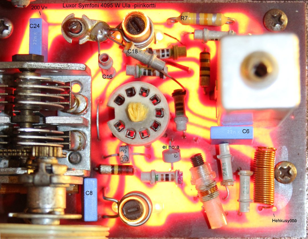 Tässä olen kahden vaiheilla – täytyisikö nuo loputkin punaiset vaihtaa pois – niitä on vielä VT-osan alkupäässä ja ULA -osissa anodijännitteen stabiloinnissa.