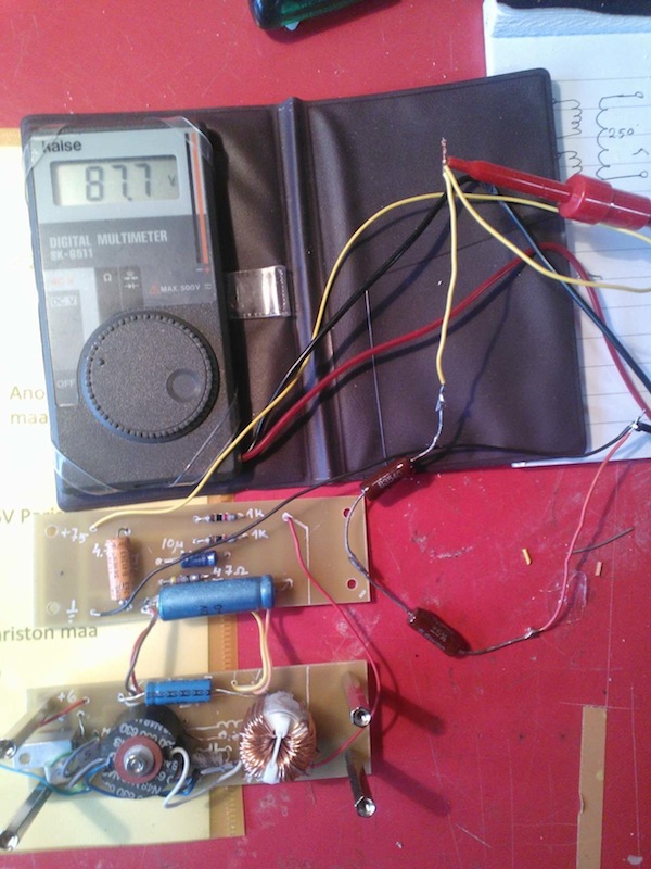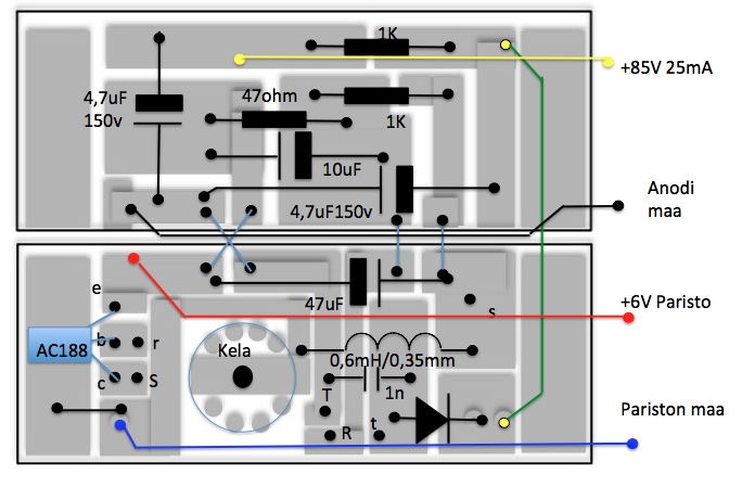 Ajatus on koettaa kloonata ko. muuttaja ja testata miten se häiritsee am. alueita. Otetaan vaikka juuri työn alla oleva ASA495 johon ei anodiparistoa enään saa niin 70..90V jännitteen voisi tehdä vaikka neljästä D paristosta.