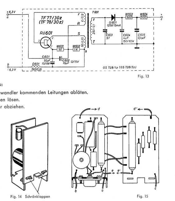 Ahaa, nyt selvisi. Minulla on kuvia Blaupunkt Bremen Tr 3460 radiosta, jossa on GS728/1z transistorimuuttaja. Muutaja on sama kuin Balticsuperin kuvissa. Alussa oleva kaavio on myös tästä muuttajasta. Radiossa on pt-pääteaste transistoroitu (2xOD603). Radiossa on vain keskiaalot ja pitkä aallot.