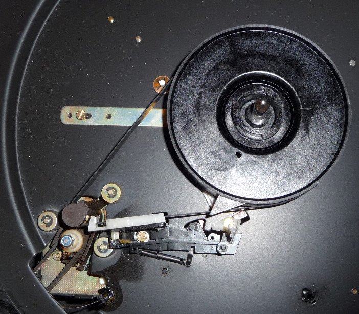 Levysoitin ei lähtenyt pyörimään ja arvasin että vetohihna on poikki, niin kuin olikin. Tilalle ei löytynyt juuri sopivaa hihnaa 0,6 * 4,8 mm Ø 115 (pituus= 362) Partco:sta. Löytyi vain Ø 122 *0,6 * 6,0 mm; saisi olla vähä lyhyempi, mutta toimii hyvin kuitenkin ja saa oikean nopeuden - hihna Ø 108 * 0,8 * 5,0 oli loppunut.
