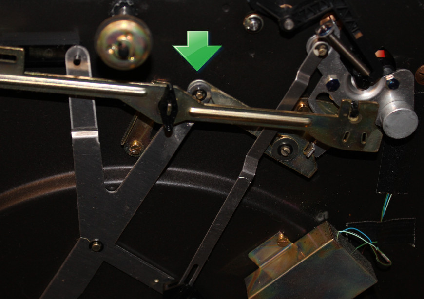No ei se vieläkään lähtenyt pyörittämään levylautasta ja tämä tiesi että koneiston joutuu irrottamaa. Sitä sai tovin pähkäillä miten tuo lähtee irti kun ei ollut muita ruuveja kun nuo kaksi levylautasen vieressä. Koitin niitä ruuvailla suuntaan jos toiseenkin (kuvassa Dual506napa). Ne on tarkoitettu kuljetuksen ajaksi lukitsemaan koko koneisto alustaansa. Sitten keksin että kallistamalla (yhtä kerrallaan) ruuvia riittävästi keskelle päin saa koneiston irrotettua. Tietysti rasvat oli pikeentyneet ja yhden nivelen (vihreä nuoli) heikko kierrejousi ei jaksanut liikuttaa vipua. Tähän ensin elektrospray:tä joka ei kuitenkaan heti auttanut ja laitoin vielä ruosteen irrottajaa joka sitten pehmensi ja huuhtoi pois vanhaa rasvaa ja vähän kaukokirjoitin öljyä tilalle (on erittäin ohutta) sai nivelen toimimaan.