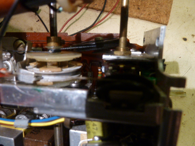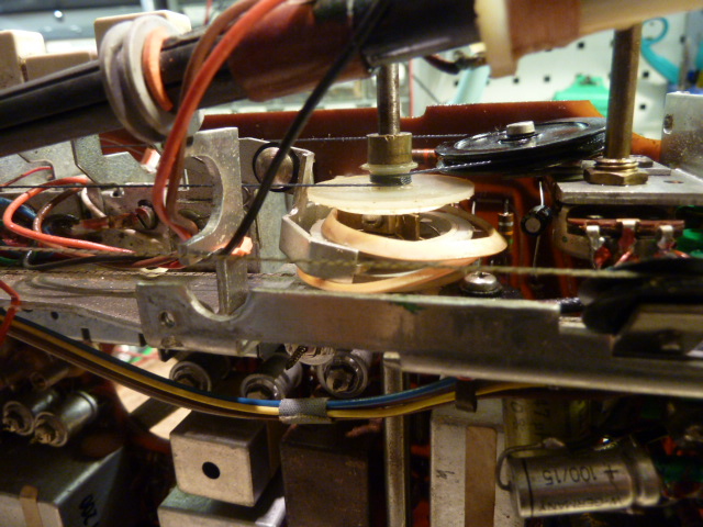 Sitten ikäviin onglemiin.  Tässä on monimutkainen koneisto, jolla liikutellaan erikseen ulan ja am'n säätöjä. Sama säätönuppi molemmille ja sitten mekaaninen kytkin, joka valitsee, että kumpaa säädintä liikutetaan. Asema-nappuloista menee mekaaninen vipu, joka kääntää mekaanisen kytkinlevyn asentoa.   Mielestäni insinöörit ovat tehneet liian 'hienoa' mekaniikkaa.  Tässä se nyt ei toimi.  Kokonaisuutta on vaikea kuvailla sanoilla ... mutta perus ongelma on akselin hapettuminen (ei edes ruosteessa) .. tällöin akseli paksuuntuu (tai muovi sen ympärillä paisuu ja reikä pienenee) .. jumittaa.  Nyt molemmat säätyvät samaan aikaan.   Koitin poistaa hapettumaa erilaisilla litkuilla (crc , ruosteenpoisto) ... sainkin osittain holkit pyörimään,mutta sitten irtosivat kytkinlevyihin liimatut kitkakumipinnat/renkaat (kuvassa) ja koko systeemi oli 'paska'.  Taas tuli oppia kantapään kautta ... pitäisi aina miettiä kolme kertaa, ennen kuin ruiskuttelee litkuja outoihin paikkoihin.  Noita kumirenkaita ei varmaan saa mistään ja niiden vaihtamiseksi pitäisi poistaa ainakin FM puolen asteikkonarut. Pikakorjauksena katkaisin renkaat pois ja laitoin pikaliimalla niistä kolme palaa kehälle  korvaamaan koko rengasta. Teoriassa toimii ... jos liima pitää.  Odottelin 15min ja kokeilin. Suhteellisen hyvin toimi. Täytyy antaa ajan kulua ja katsoa, että onko korjaus kestävä.