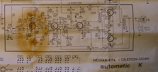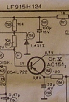 Radio hyytyi taas ... kuului vain tasaista suhinaa riippumatta kanavasta.  Ihmettelin tuota vihreää diodia, joka lienee jokinlainen zeneri. Se kaiketi tekee kantajännitteet trankuille. Diodin yli oli 0,7 V ... ja kantajännitteet olivat välitaajuusasteessa noin 0,6V. Piti olla kaavion mukaan 1,1V.