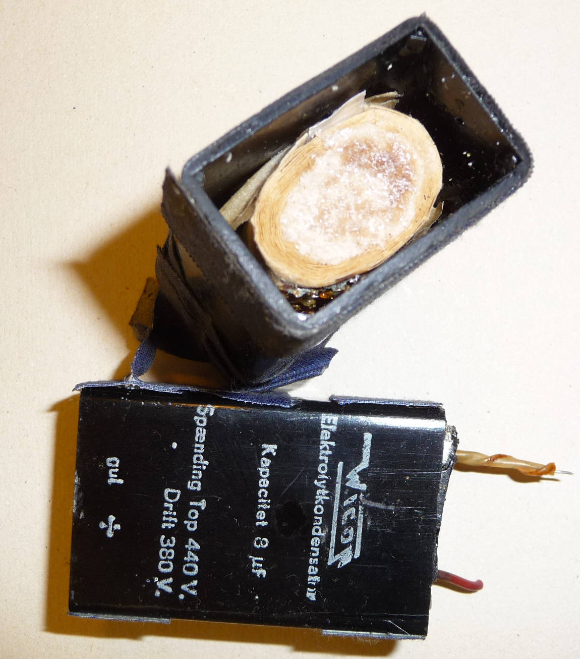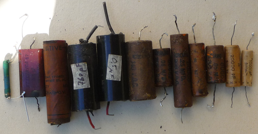 Radiossa pitäisi olla 3 kondensaattorin blokki (ryhmäkondensaattori, elektrolyytti), mutta ei löytynyt – vaan on kaksi kantikasta ja tasasuuntausputkella kaksi mustaa pötkylää, joista on piki sulanut – valunut.