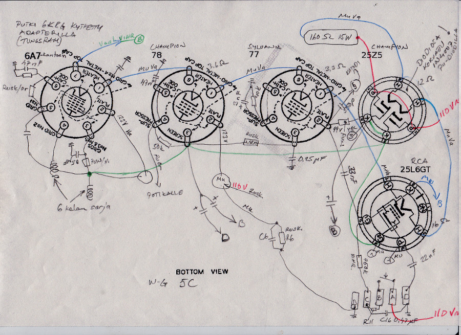 Kun en löytänyt tähän radioon suoraan sopivaa kytkinkaaviota, täytyy mennä 05A:n kaaviolla. Kun eka putki on vaihtunut joskus 6AT:stä 6K8G:ksi joka on kiinni adapterilla ja pääteputki onkin RCA:n 25L6GT joka on Octal8 kannalla, on tätä konetta remontoitu aiemminkin melkoisesti.