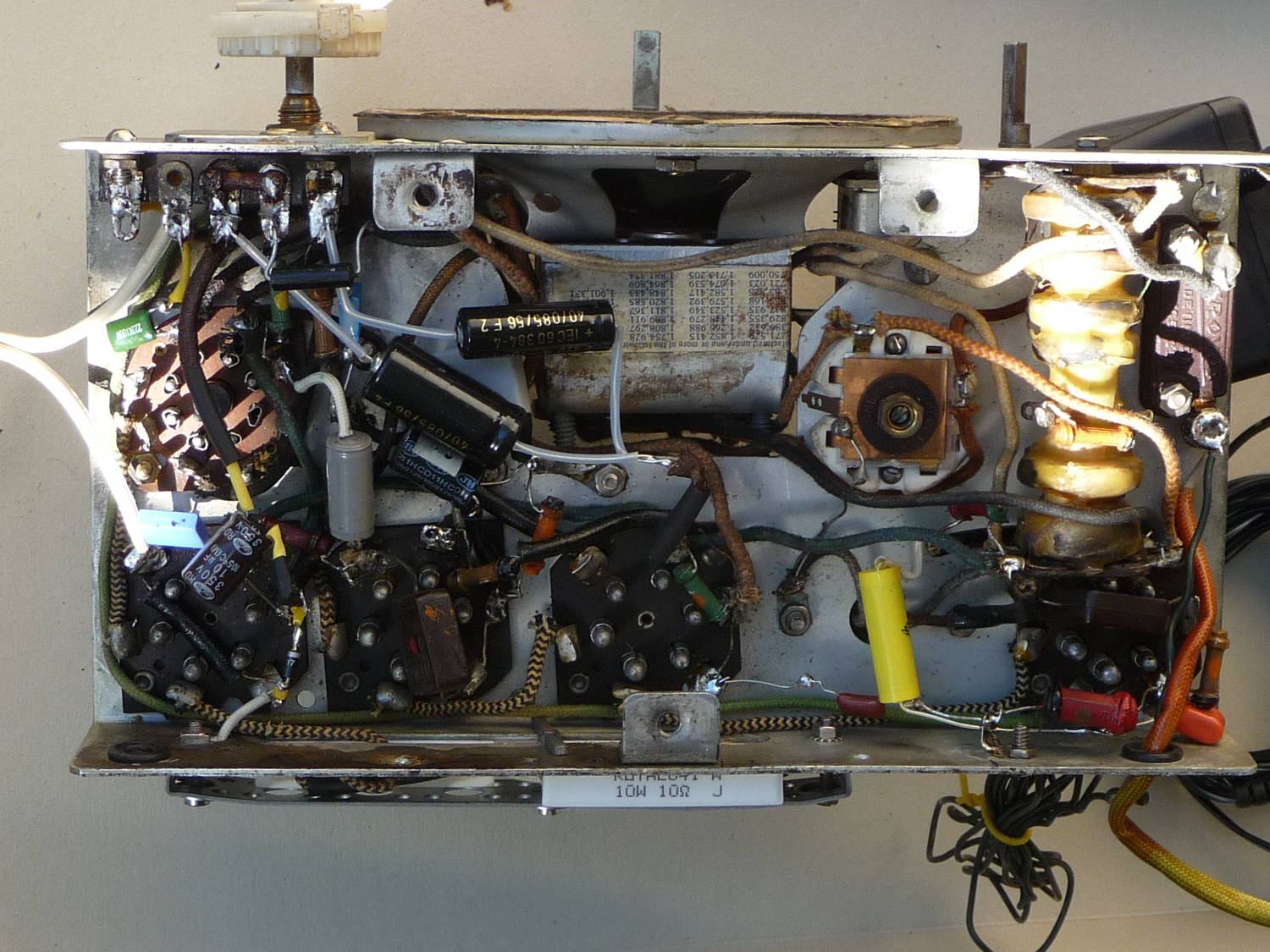 Minua rupesi kiinnostamaan tämä kone sen verran, että vaihdan lähes kaikki kondensaattorit ja sitten vielä tulee tuo hehkujen vastus – romulaatikosta löytyy useimmat osat, vaan lyytit ja yksi polko sekä vastukset joutuu hankkimaan (Uraltone = 5€ ). Tähän olisi tarvinnut 15 W tehoisen etuvastuksen hehkuille, mutta laitan kokeilua varten vain 10 W kestoisen, laskettu tehohäviö vastuksiin 10,76 W (10+47+100 ohmia).