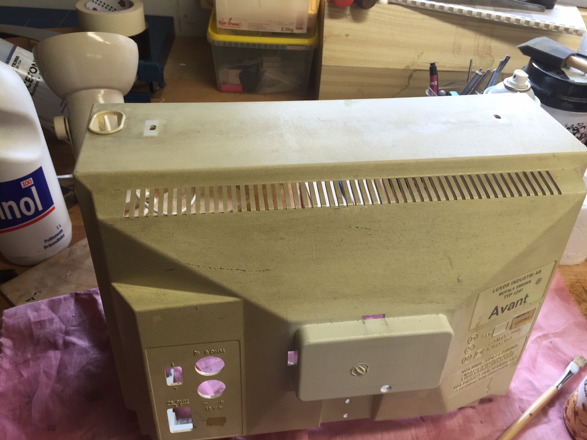 TV:n päällä vielä kuvaputken takasuoja PIZZAN värisenä. Se on nyt saamassa aurinkoa