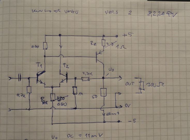 Kokeilin seuraavaksi mitoittaa vahvistimen pääteasteen siten, että varmasti riittää noille 34ohm kuulokkeille. Muutin vakiovirtalähteen emitterivastuksen 12ohm'ksi, jolloin 'lepovirta' =56mA ja ulos lähti puhtaasti 1,1Vrms (35mW) . Varmasti riittää. Pienensin vahvistuksen arvoon 2 ... takaisinkytkentävastuksen 4,7K ohm tilalle 1K. Voi olla, että 1,5K olisi sopivampi?