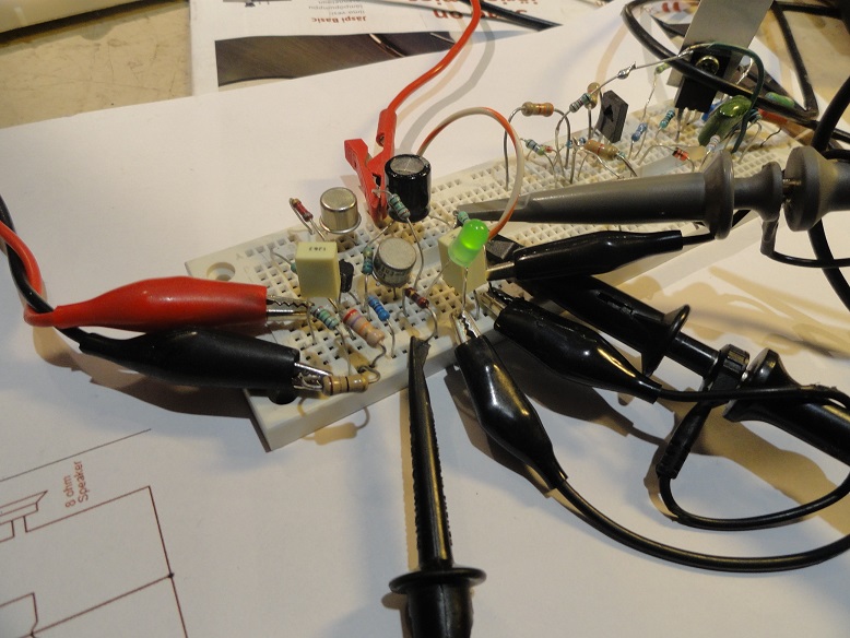 Kaikki kytkennän trankut voivat olla muitakin. Itsellä sattui vain olemaan noita tarjolla. Koitin valita sellaisia, joissa on iso virtavahvistus (omat : BC547B - hfe 425 ja MJE210 - hfe 393) . Tällöin takaisinkytkentä toimii tehokkaammin säröä pienentäen. Tätä kytkentää voi virittää varmaankin paremmaksi. Ekat kaksi trankkua kannattaa valita niin, että niissä on mahdollisimman samat Ube jännitteet (testerillä mitaten). Omissani nuo olivat 700 ja 707mV. Tuo päätetrankku sen mukaan, että kestää tuon pääteasteen läpi kulkevan virran (versiossa 1 se oli 100mA) ja syntyvän tehohäviön.