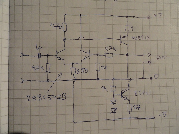 Sitten rakensin Arton kytkennän. Trankkuina minulla BC547b (mitattu hfe 428) ja BC 141 ja BC161. Kytkentä toimi laakista, mutta on herkempi häiriöille. Jännitteet prikulleen Arton ilmoittamat. Huomasin, että tiputtamalla etuvastuksia R1/R3 särö laski ja samalla myös häiriöherkyys parani.