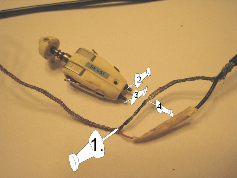 Siis äänirasiasta lähtee piuha 1. jossa on musta/punainen johdin kierretty metallisukan sisään. Punainen ja musta johdin menee äänirasian liittimiin 2. ja 3. ja sukka äänirasian kiinnikysrautoihin.