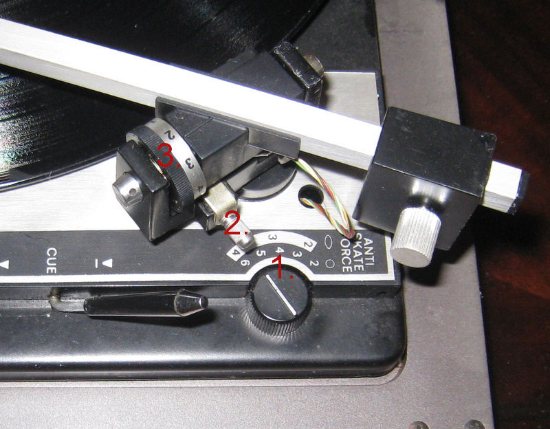3 = neulapainon hienosäätö, laita säätö nollille, siirrä punnusta niin että äänivarsi kelluu tasapainossa, lukitse punnus, säädä 3 numeroiden 1.5-2.0 välille.