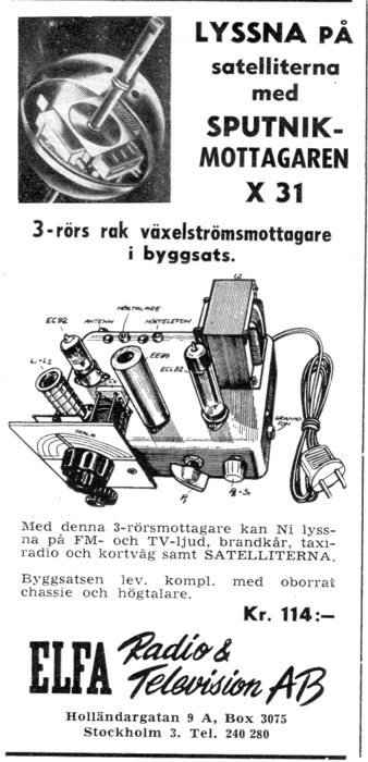 Sputnikin kuuntelemiseksi on myyty Ruotsissa rakennussarjana 3-putkista radiota. Varsinainen satelliittivastaanotin ja onhan sillä voinut kuunnella muutakin (ULA, TV-ääni, taksi- ja viranomaisradiot). Mainos Radio och television -lehdestä 12/1957.