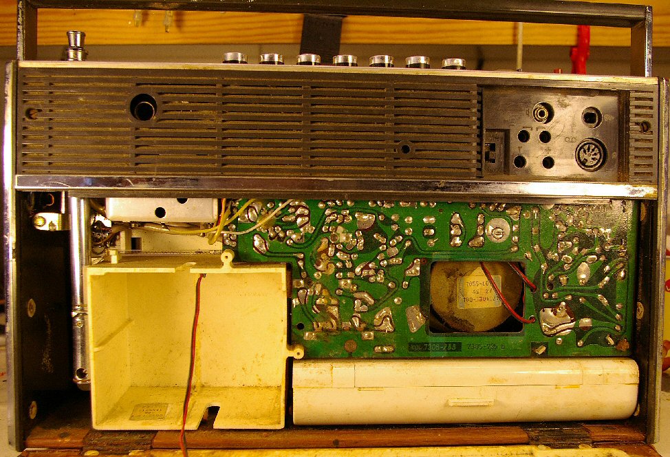 Ohessa kuva radiosta takakansi avattuna. Levyn alareunassa on teksti:" kpl 7305-733 7305-735 b" , ilmeisesti koneiston tyyppi tms.