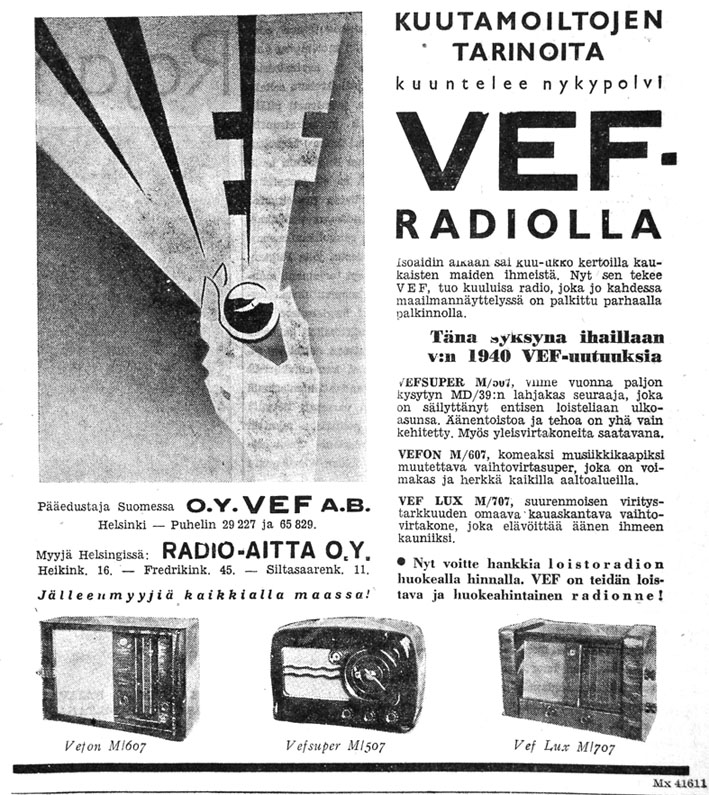VEF-ilmoitus Helsingin Sanomissa elokuulla 1939.