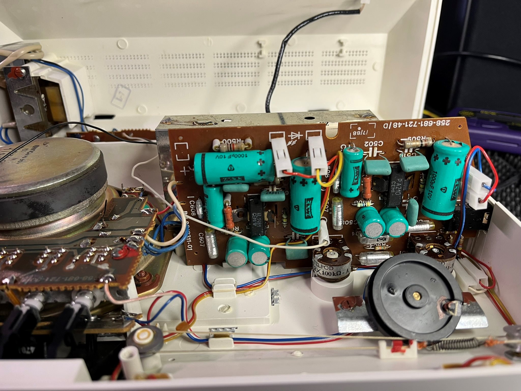 Luulin myös ensin että stereovalo ei pala mutta syttyy se kun työntää kuulokeplugin paikoilleen. Syy selviää kytkentäkaaviosta, samalla Motorolan stereodekooderi-IC kytkeytyy monolta stereolle. Laadukkaan näköiset puolalaiset elkot, mittasin ne esr-mittarilla. Vain verkkolaitteen jälkimmäinen (100 uF) suodatinelko oli epäilyttävä ja vaihdon sen koska se on kuumassa paikassa ihan regulaattoritransistorin jäähdytyslevyn yläpuolella.