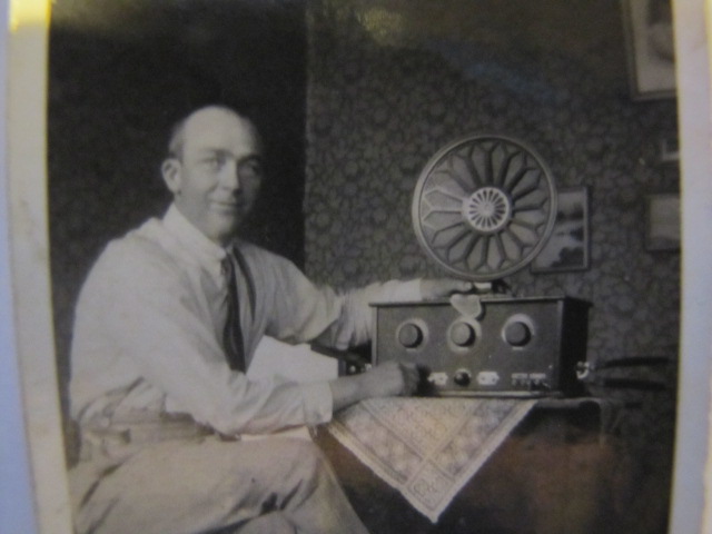 Tunnistaako kukaan kuvan herrasmiehen vastaanottimen.Kaiutin lienee 1920-luvun lopun Grawor mutta vastaanotin arvoitus.