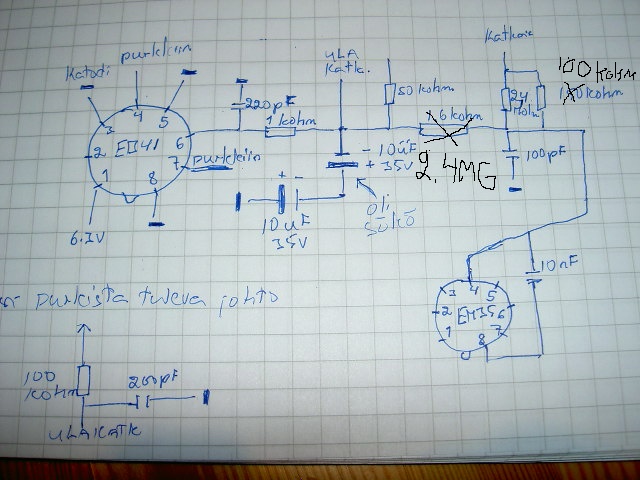 Olisikohan piirtämässäsi kaaviossa jokin virhe, näyttää ainakin hieman oudolta. Liitteenä tavanomainen (Ula) suhdeilmaisin. Kynällä kirjoitettu putken EB41 vastaavat nastat. Komoponettien arvoissa voisi olla eroja mutta suuruluokka pitäsi olla sama.