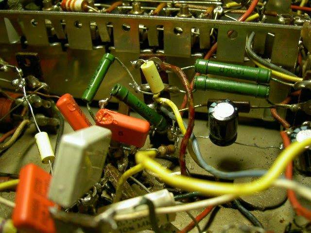 on kuettavissa vastuksista, muut vastukset ovat vihreitä keraamisen näköisiä samoin kuin 200/100pf konkat.