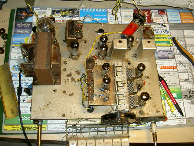 Ihmettelin kun yhdessä j-korvassa oli tinaa muttei muuta ja kattelin että törön kirjassa siinä mielestäni pitäisi olla C11 (sivulla109), kokeilin siihen erilaisia 4,7nf - 220pf ei niissä paljoa eroa ollut, toimii hyvin kumminkin 2,2nf konkalla. Jos Timo joskus kurkaa mikä omassa radiossa siinä kohtaa kuuluu olla. Kuvassa se on keltainen keskellä ylhäällä.