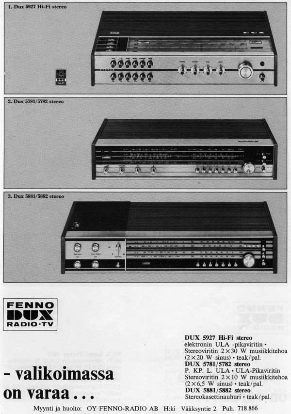 Hei, minulla kanssa Dux SX6851 viritinvahvistin myynnissä ja siitäkään ei löydy netistä tietoa. Mutta ilmeisesti samanlaista mallia on myös Philips valmistanut 70-80 luvun vaihteessa. Philipsin radioita ja telkkareita ym hifiä tehtiin TERATEn tehtaalla Helsingissä v.72-81 jolloin olin nuorena tyttönä itsekkin siellä vähän aikaa töissä.
