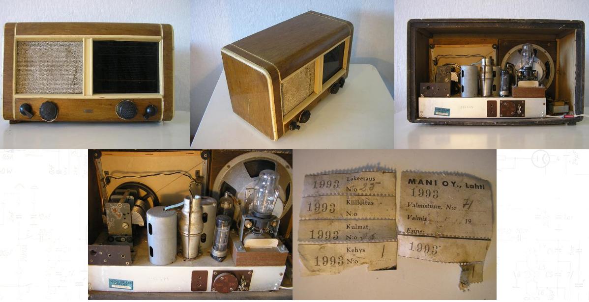 Tällainen tulokas on kokoelmassani, "merkki" Versa. Takalevy puuttuu, joten malli on hämärän peitossa. Kovasti Helvarilta näyttää mutta putkitus on erikoinen: ECH21, 6K7G, 6K7G, EBL21, AZ1. Ei ole käytetty EF22:ia vaan 6K7G:tä joka ei ole kantayhteensopiva. Pula-ajan ratkaisulta vaikuttaa, liekö ollut puutetta EF22:sta...?