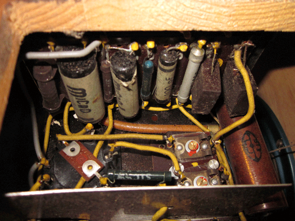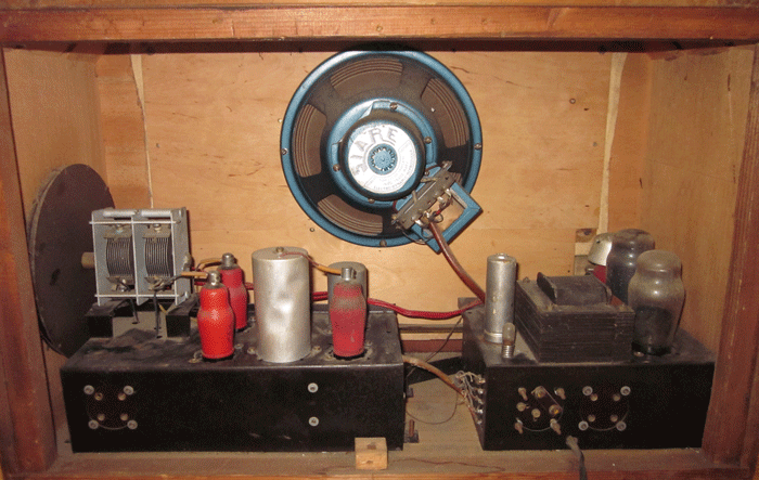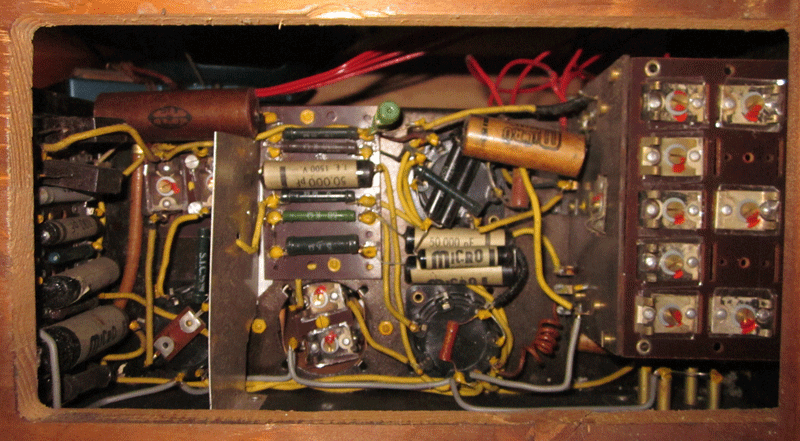 Outo on putkitus, ettei vaan joku putki olisi vaihtunut? En millään jaksa uskoa suoraan vastaanottimeen, putkia on liikaa ja ei kai tuohon aikaan enää muutenkaan suoria enää kaupallisesti juuri tehty? Koneistossa näkyy pari alumiinipönttöä, voisi kuvitella vt-muuntajiksi, toisaalta viritysreikiä ei näy vai onko pohjan puolella? Suorassa pitäisi olla myös takaisinkytkennän säätö jossain.