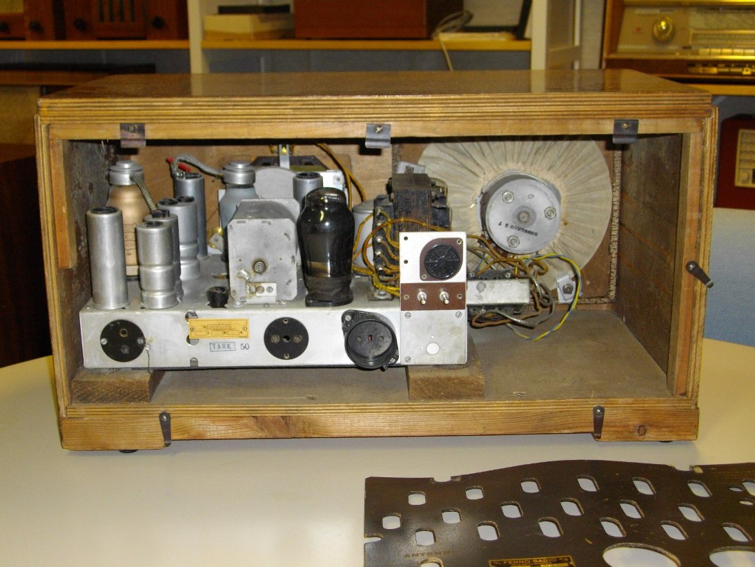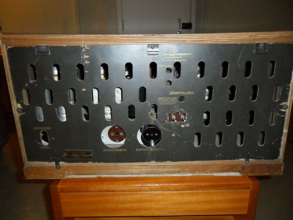 Tässä olisi kuva takaa. Valitettavasti se ei ole kovin hyvälaatuinen. Radio on sen verran painava, että en lähtenyt sitä siirtämään pois varastotiloista.