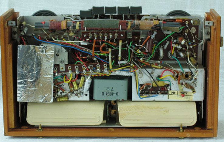 löytyy pari kuvaa koneistosta.Laite on puukuorinen.Lisään tarvittaessa.Kuten ehkä näkyy,kaiutin on 12-ohminen,päätemuuntajaa ei ilmeisesti ole, ainoastaan ohjausmuuntaja päätetransistoreille.Ongelmani on se,että kun sain radion, siitä oli muutamia johtimia irti; mm jännitesyötöt ja helpottaisi kovasti jos skema löytyisi.Pääteasteen ja pt-vahvistimen transistorit näyttäisivät mittauksessa ehyiltä.