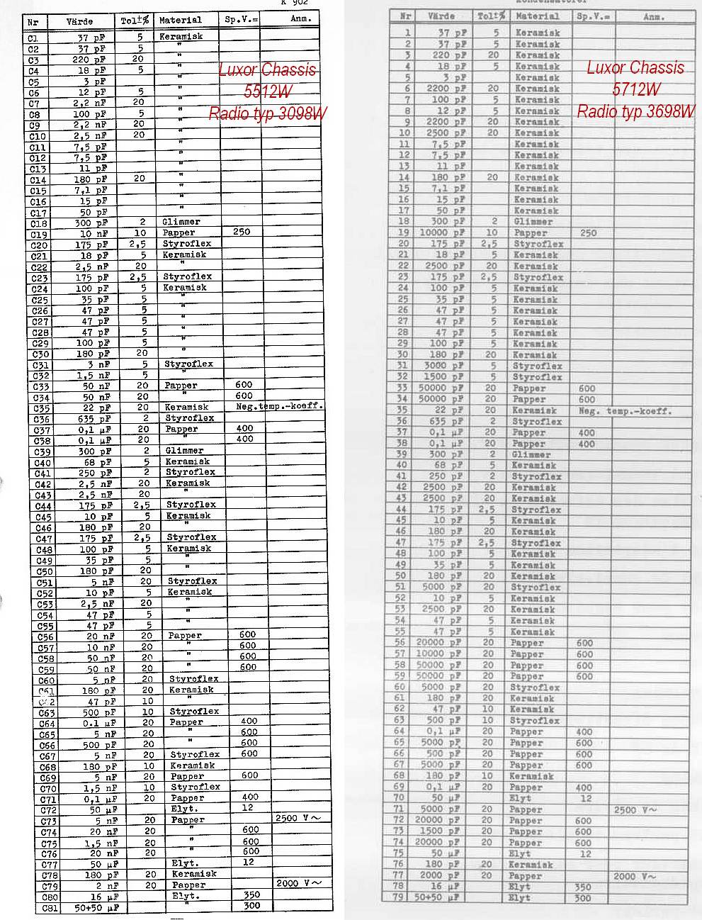Ruotsin Luxorin tyyppimerkinnät ovat erilaiset kuin Suomessa. Esim. radio typpi 3698W on chassiksella 5712W ja radio tyyppi 3098W on chassiksella 5512W. Kuvassa on molempien konkka-lista. Ei ole olemassa chassis no 5713W tai radiotyyppi 3398W.