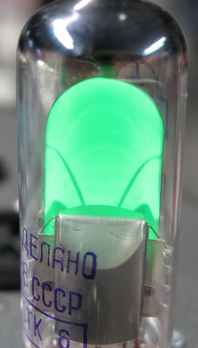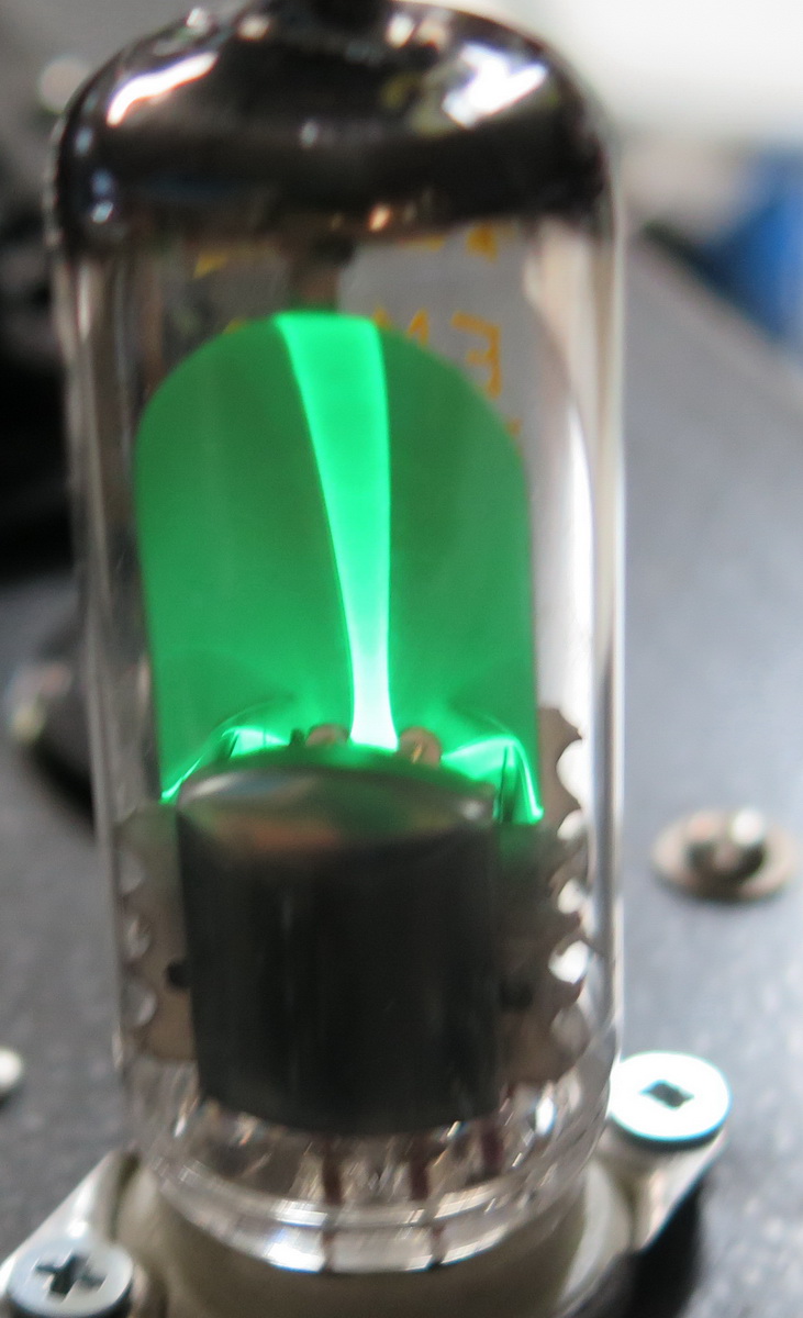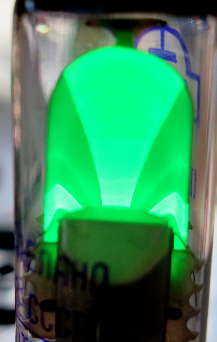 Kyllä EM80 putki toimii niin, että mitä pienempi negatiivinen jännite tulee ohjaushilalle sitä vähemmän on viuhka auki ja heikompi signaali. Voisihan EM80 käyttää toisinkin päin mutta en ole koskaan tällaista radiossa nähnyt.