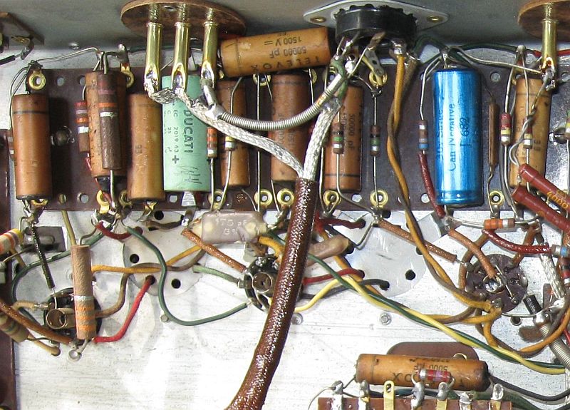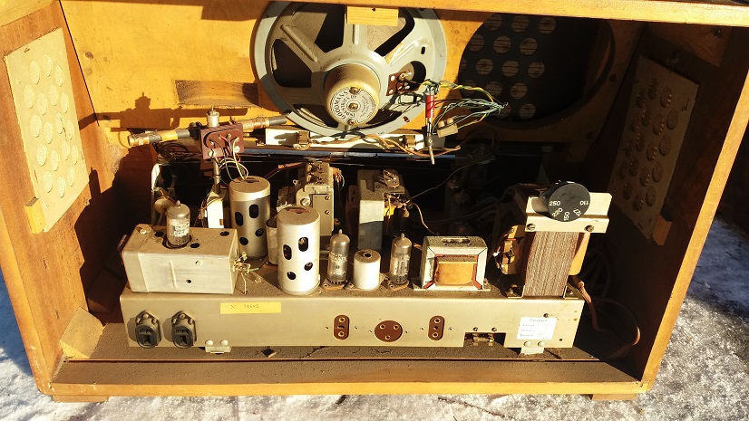 puuttuu takapahvi ja 3 kajaria. Hilakonkkien vaihdoilla alkoi laulaa ... mutta tehoa on vain 0,5W. En tajua , tuon päätemuuntajan päällä olevan kaiutinliittimen kytkentää. Tämän laitteen tutkimus jatkuu tuonnempana. Moni konkka näyttää saaneen siipeensä. Pinta on pahasti halkeillut.