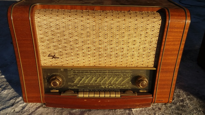 Vehje lienee maannut kylmässä (mutta kuivassa) ladossa pitkään. Kotelon viilu on irronnut pahasti yhdestä kohdasta. Tuon ainoan kajarin johtoihin oli liitetty banaanikoskettimet ... olisiko käytetty radiota kajarina?