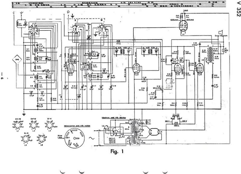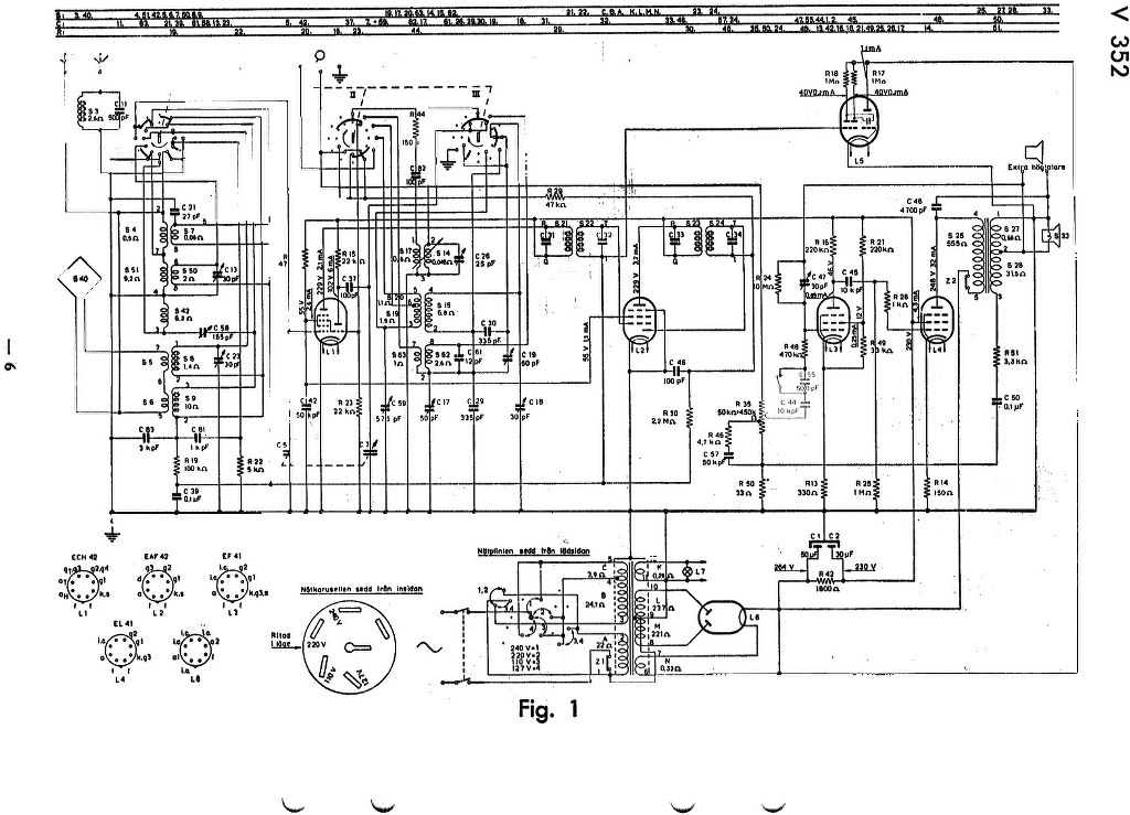 Se toimii tuon levysoitinliitännän kautta. Sinne menee 2 johdinta ja vaippa eli kolme johdinta. Yliheittimet ovat KV1 eli toiseksi alimmaisessa asennos. Alin asento on levysoitin. Levysoitin kuuluu, oli tuo valinta missä asennossa tahansa eli kaikilta aaltoalueilta. Tuossa II kakussa on levarin valinta. Noiden liukujen asentoa en oikein tajua. Minusta tuo levarin inputti menee suoraa R35 yläpäähän ja sieltä EF 41 kautta pääteasteelle EL41.