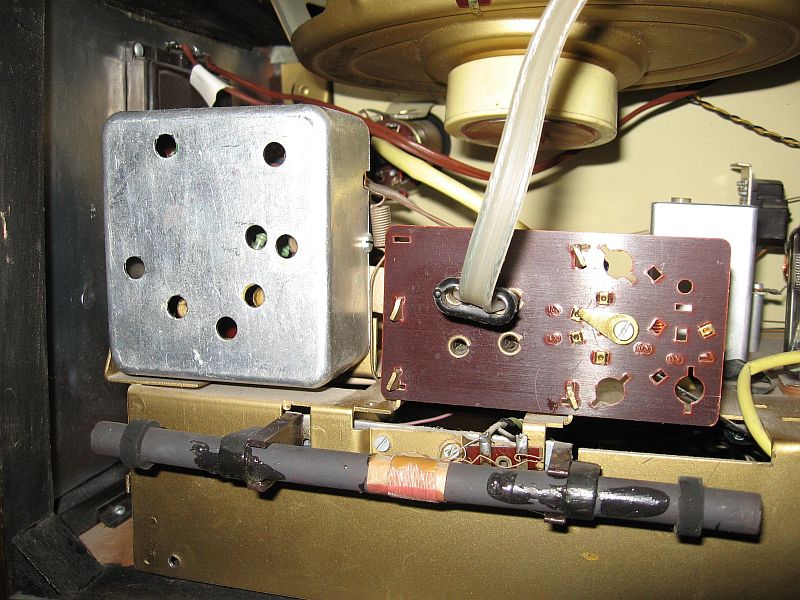 Erona tuohon saksalaismalliin muutakin kuin ulkoasu, tässä ei nimittäin ole sivuilla noita elektrostaattisia kaiuttimia, näkyvillä vain nuo kaksi katossa olevaa. Äänipuolen muuntajalta lähtee kyllä samalaiset piuhat kuin tuossa toisessakin, ne vaan on vedetty tuonne jonnekin asteikon taakse. Täytyy kaivaa, olisiko tässä sitten jemmattu yksi kaiutin jonnekin muualle.