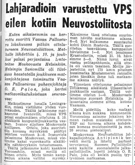 Alla olevan lehtiselostuksen mukaan Vaasan Palloseuran joukkueen pelaajat saivat v. 1956 lokakuussa kiertueellaan Neuvostoliitossa "komeat radiot".