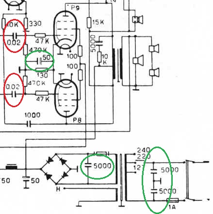 [quote author=3A23313C3D393B31500 link=1339062877/2#2 date=1339066716]^ Kahden EL84-putken hankkiminen varaosiksi/testausta varten tai ainakin pääteputkien hilavirtaa rajoittavien kondensaattoreiden (ympyröity liitekuvassa punaisella) tarkistus/vaihto saattaisi olla tuon jälkeen eräs suhteellisen hyvä lähtökohta. Jännitteenvalitsinkin kannattaa asettaa asentoon 240V ellei se jo ole.